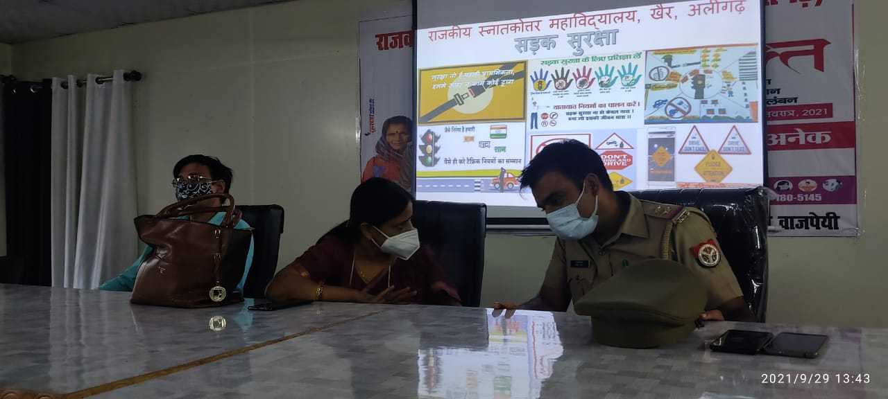 इस अवसर पर सड़क सुरक्षा विषय पर प्राचार्या जी की अध्यक्षता में एक विचार गोष्ठी का भी आयोजन कराया गया जिसमे मुख्य अतिथि के रूप में आमंत्रित खैर चौकी प्रभारी श्री अंकित चौधरी ने विस्तार से सड़क सुरक्षा के नियमों के विषय में बताया। उन्होंने कहा कि कभी कभी किसी एक व्यक्ति की जल्दबाजी के कारण सड़क पर जाम लग जाता है । अतः प्रत्येक व्यक्ति की नैतिक जिम्मेदारी है कि यातायात के नियमों का पालन करे।